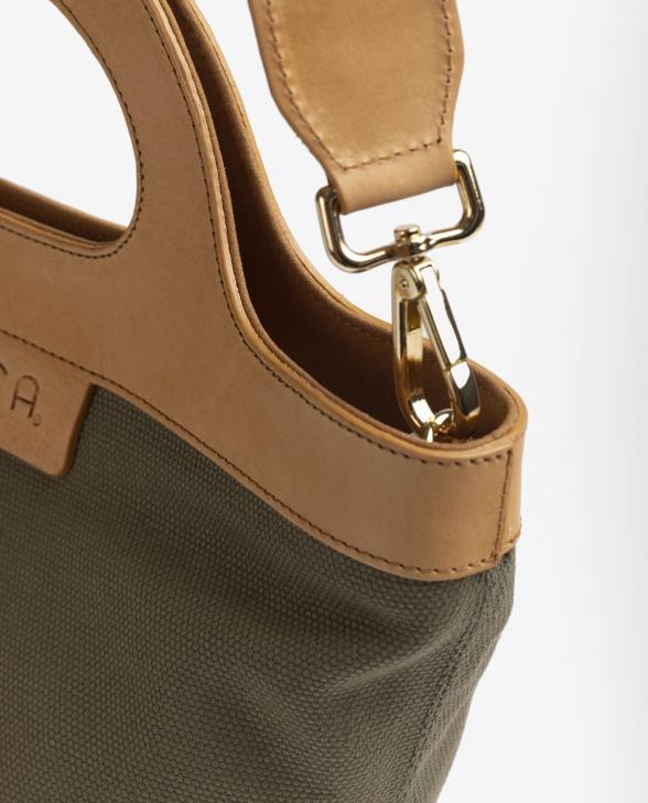 Small recycled fabric handbag. With a leather handle and Unisa logo trim. Adjustable crossbody strap inside and a magnetic snap closure. 23 cm x 35 cm x 13 cm