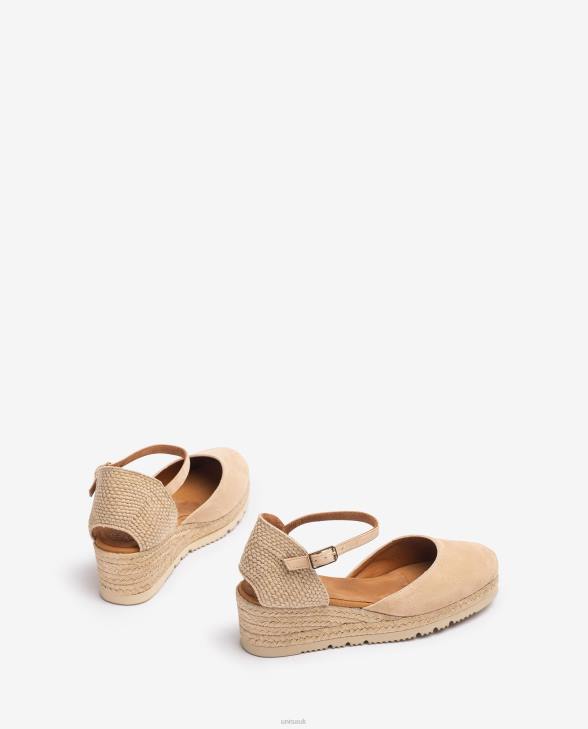 D'Orsay ankle strap round toe espadrille made in suede. Raffia heel with a strap that can be adjusted with the metal buckle. 3.5cm high wedge covered in natural colour jute and a 1cm platform. Lighter and more flexible EVA sole than ever before thanks to the SuperLight technology. The essence of the Mediterranean in Unisa shoes.