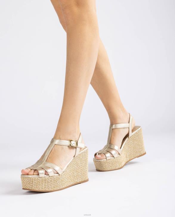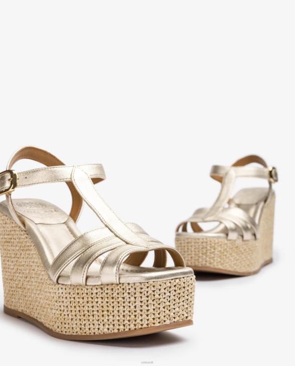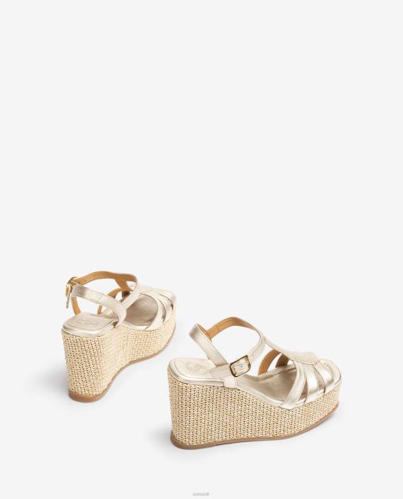 Square toe sandal made in metallic effect leather. Straps on the front and on the instep and an ankle strap that can be adjusted using the metal buckle. 10cm high wedge and a 4cm platform covered with natural raffia. Light, non-slip, rubber sole. Sandals with innovative designs for all your events.