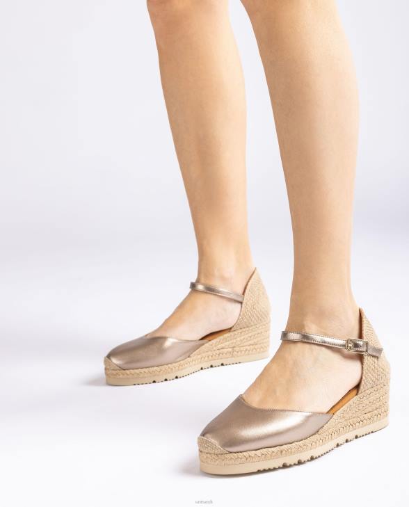D'Orsay ankle strap round toe espadrille made in metallic effect leather. Raffia heel with a strap that can be adjusted with the metal buckle. 3.5cm high wedge covered in natural colour jute and a 1cm platform. Lighter and more flexible EVA sole than ever before thanks to the SuperLight technology. The essence of the Mediterranean in Unisa shoes.