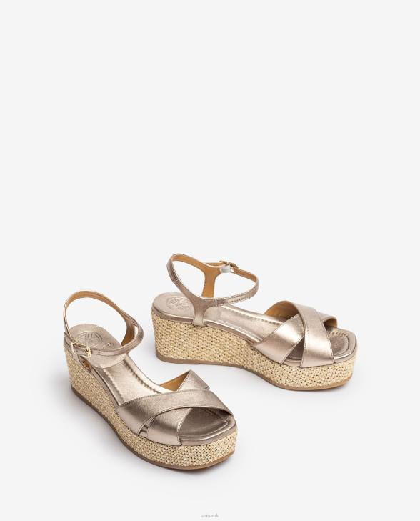 Square toe sandal made in metallic effect leather. Crossover straps on the front and an ankle strap that can be adjusted using the metal buckle. 5cm high wedge covered with natural raffia and a 3cm platform. Light, non-slip, rubber sole. Comfort brought to its full glory.