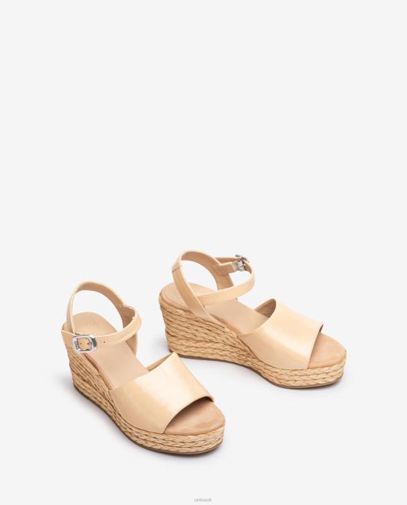 Wide vamp shiny leather square toe sandal. Ankle strap that can be adjusted using the metal buckle. 8 cm wedge heel covered in braided jute and 3 cm platform. Non-slip rubber sole.