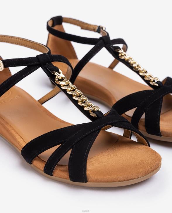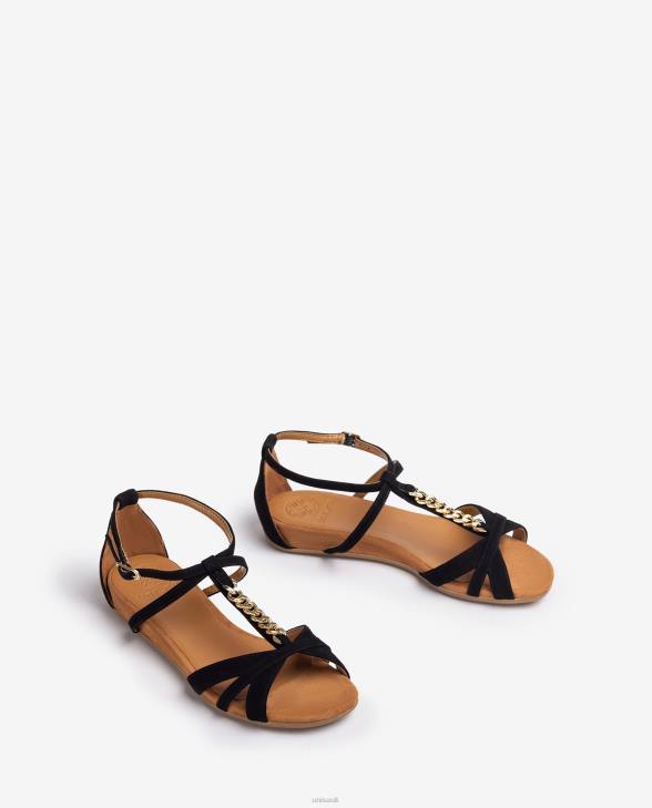 Round toe suede sandal. Metal chain trim on the front and an ankle strap that can be adjusted with a buckle. Light, flexible, non-slip, rubber sole. Design and comfort in our summer 2023 collection.