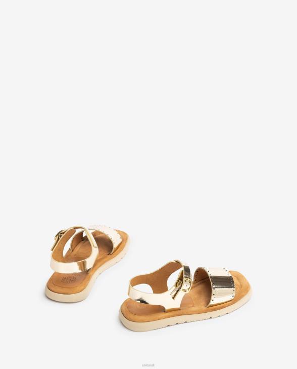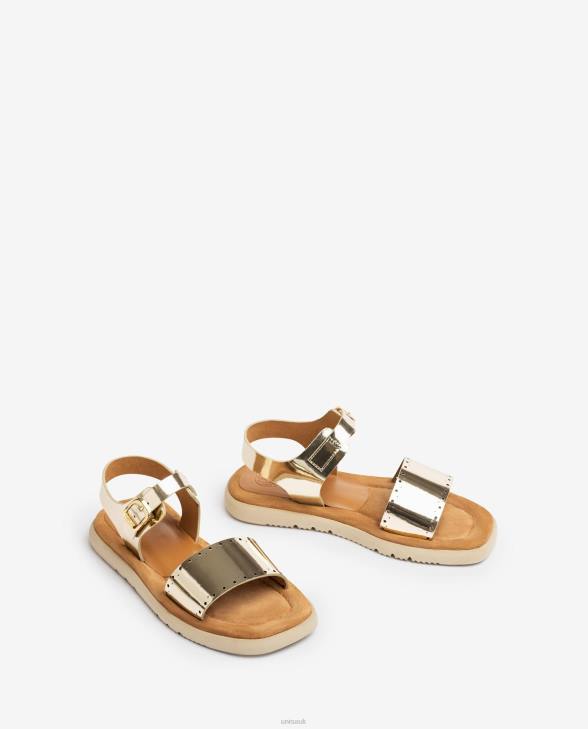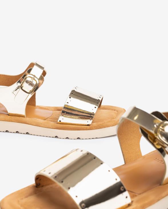 Flat square toe sandal made in metallic effect leather. Wide vamp with punching trim and an ankle strap that can be adjusted with the metallic buckle. Thick foam in the whole sole for more comfort. Lighter and more flexible EVA than ever before thanks to the SuperLight technology. Our SuperLight technology will be your best companion this season.
