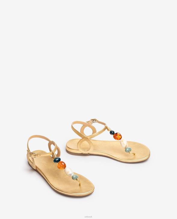 Round toe-post sandal made in metallic effect leather. Coloured rhinestone trim on the instep. Ankle strap that can be adjusted with the metal buckle. Light, flexible, non-slip, rubber sole.