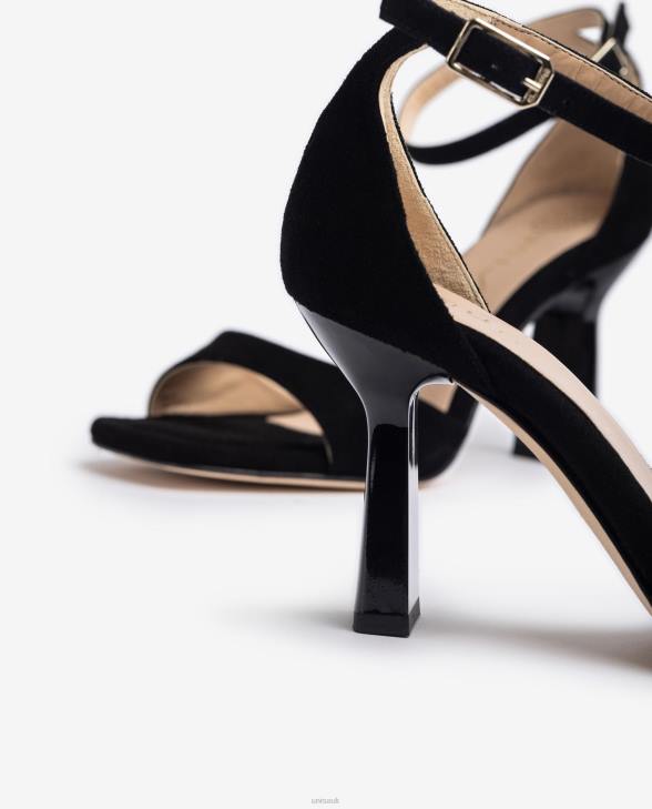 Black kid suede sandals. Adjustable buckle strap at the ankle. Geometric heel to the tone of 8.5cm high. Very cushioned sole for your comfort, you will be surprised by the comfort of these sandals!