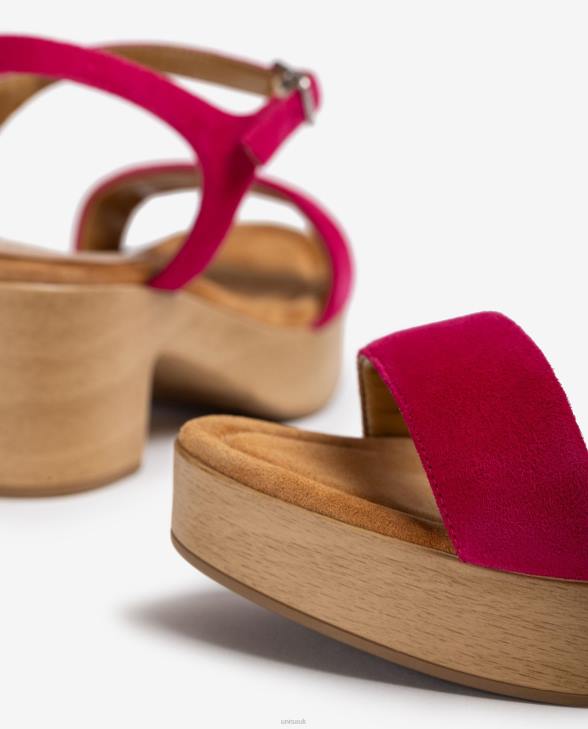 Round toe suede sandal. Ankle strap that can be adjusted with the metal buckle. Light 5.5cm high block heel and a 3cm wood effect platform. Light, non-slip, rubber sole. Unisa essence in its pure state.