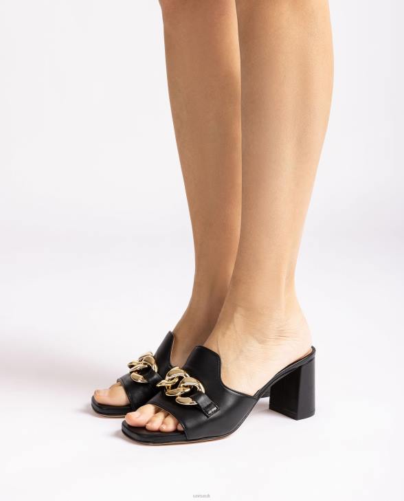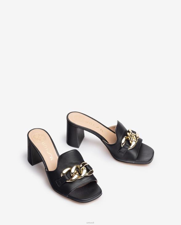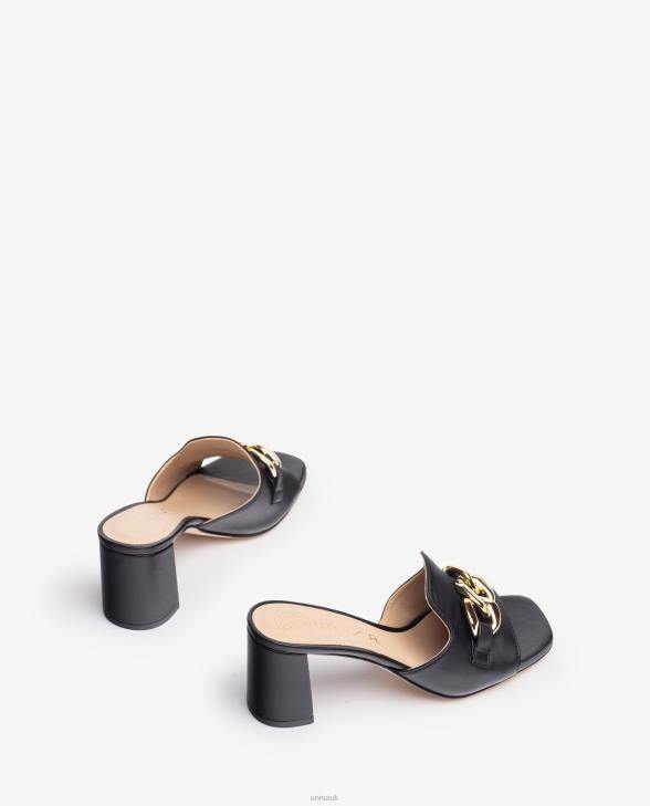 Square toe mule sandal made in leather. Wide vamp with painted metallic effect chain trim. Matching tone 6.5cm heel. Leather sole. Made in Spain designs that will impress everyone.