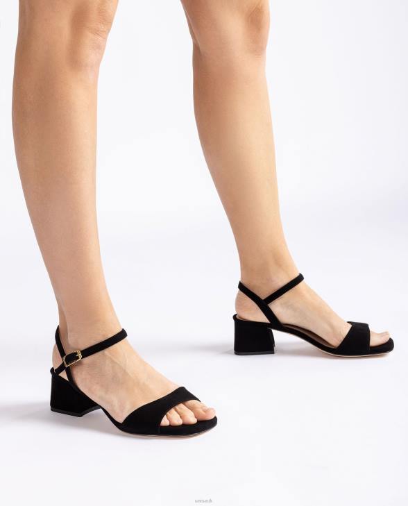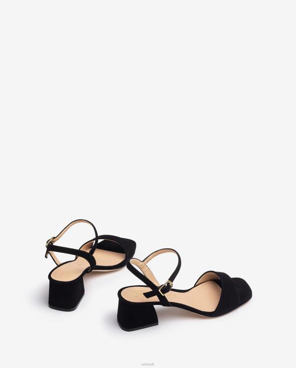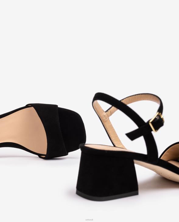 Square toe sandal made in suede. Matching tone wide heel 5cm high. Ankle strap that can be adjusted using the metal buckle. Leather sole. Essential Unisa classics that are revamped each season.