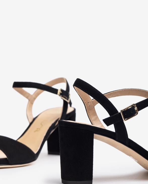 Suede sandals. Ankle strap that can be adjusted using the metal buckle. Square sole unit covered in matching colour leather and a 6 cm wide heel. Non-slip leather outsole. Essential sandals for any wardrobe.