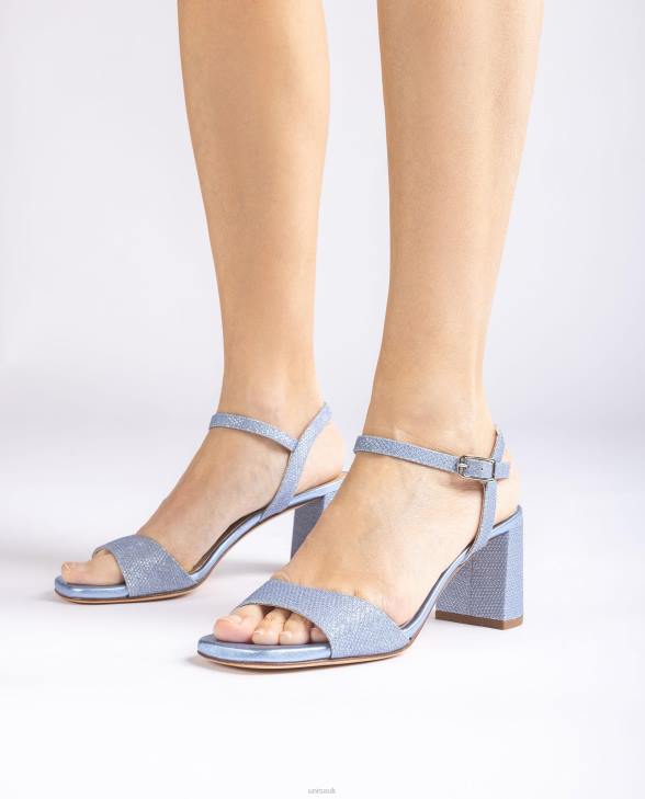 Square sole sandal made in shiny fabric. Wide 6cm heel in a matching tone. An ankle strap that can be adjusted using the metal buckle. Leather sole.