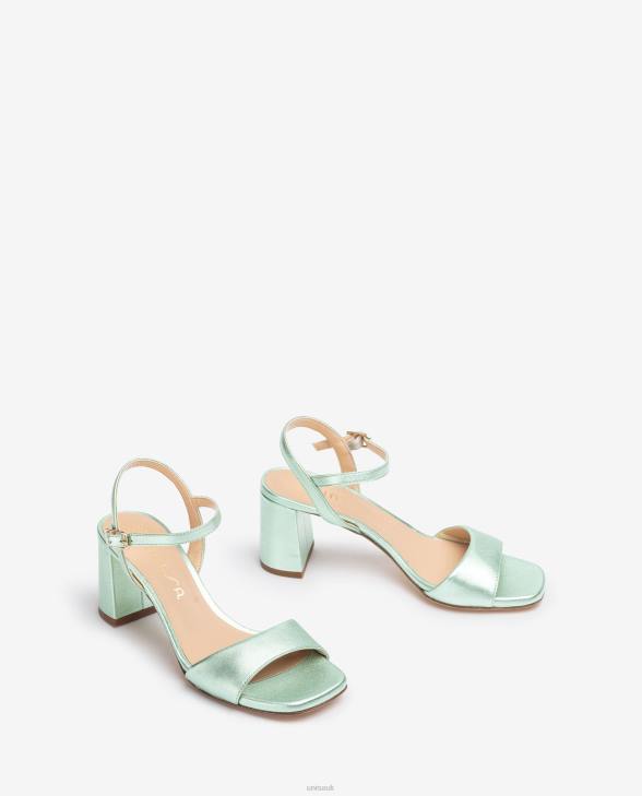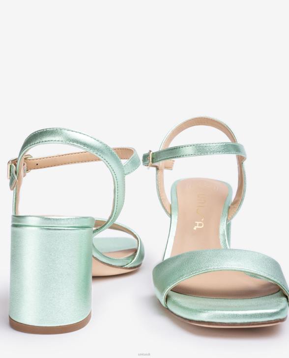 Square sole sandal made in metallic effect leather. Wide 6cm heel in a matching tone. An ankle strap that can be adjusted using the metal buckle. Leather sole.