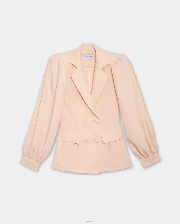 It is a straight cut fitted jacket that crosses over with four buttons, shoulder pads, lapel collar and puffy sleeves with cuffs. Two faux flap pockets on the front of the jacket and buttons covered with the same fabric. Biased finish inside. It can be worn with the Bush trousers.