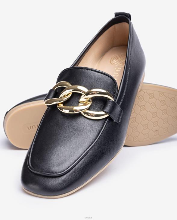 Square toe loafer made in soft leather. 2cm wood effect heel and a light, flexible and non-slip rubber sole. Very soft and comfortable fabric lining. Metallic chain trim on the front. Essential classics that are revamped each season.