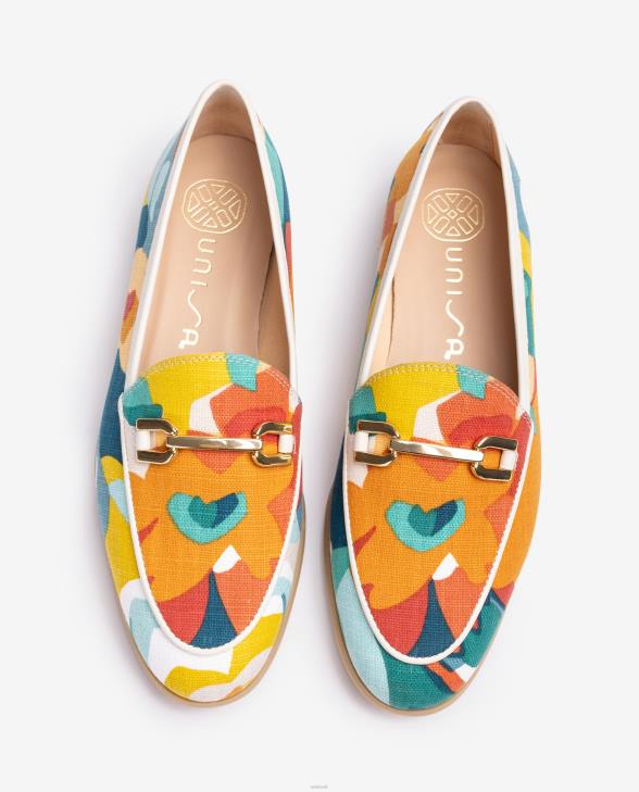 Round toe flat loafer made in multi-coloured fabric. Soft fabric lining for your comfort. Metal slot cut trim on the front. Light, flexible, non-slip, rubber sole. Now the DALCY by Unisa are here, one of the must-haves of this new season.