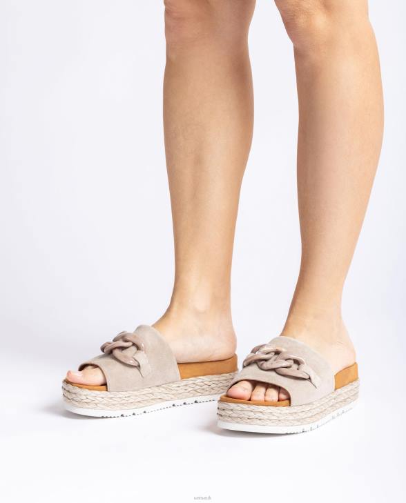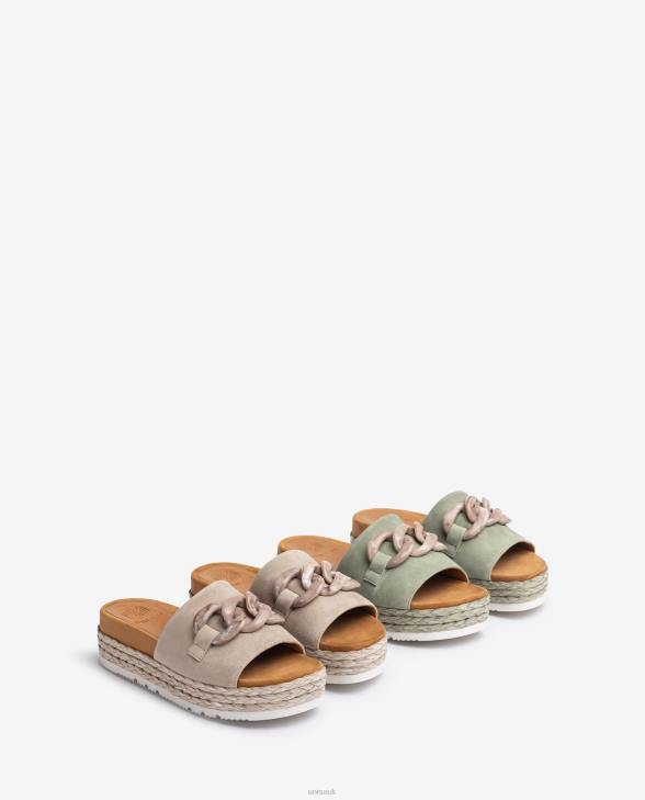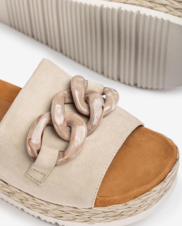 Suede mule style sandal, with 5 cm heel covered in suede and jute braiding. Matching chunky link chain trim on the vamp. Light and flexible non-slip rubber sole. Multifunctional and comfortable wedges that are perfect to create a very personal style.