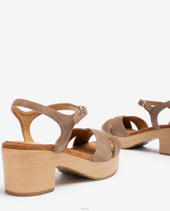 Round toe suede sandal. Ankle strap that can be adjusted with the metal buckle and crossover straps on the front. Light 5.5cm high block heel and a 3cm wood effect platform. Light, non-slip, rubber sole. Unisa essence in its pure state.