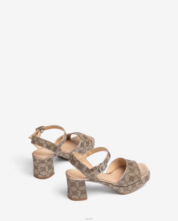 Square toe sandals made in metal effect fabric with monogram print. Platform of 2.5cm and heel of 6.5cm. Adjustable heel buckle. Make your feet shine with these sandals!