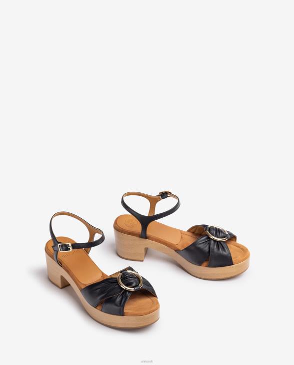 Round toe sandal made in leather. Wide crossover straps on the front with metal trim and an ankle strap that can be adjusted using the buckle. Light 5.5cm high block heel and a 3cm wood effect platform. Light, flexible, non-slip, rubber sole. The UNISA essence in its pure state.