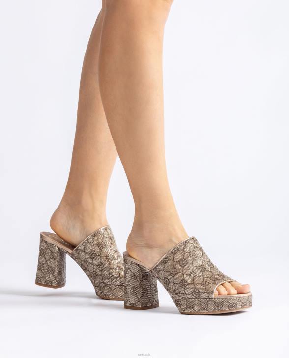 Clog type sandals with square toe, made in metal effect fabric with monogram print. With a 2.8cm platform and 9cm heel in the same fabric, make your feet shine with these sandals!