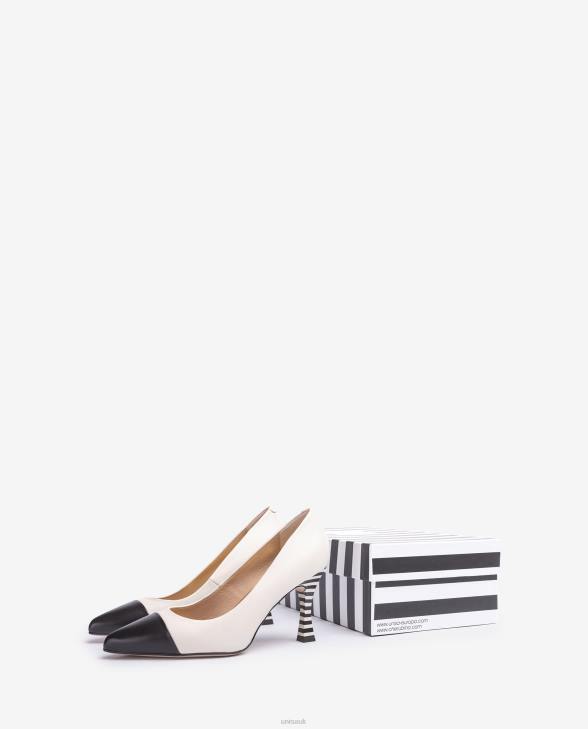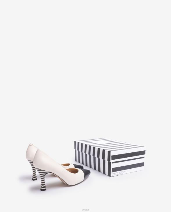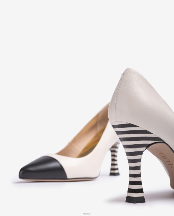 Pointed toe pump made in leather. Toe in contrasting leather. Thin 8 cm high black and white stripe heel. Leather sole. The new Unisa collection by Cherubina will captivate you with its perfection.