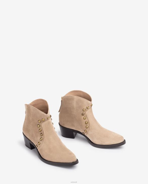 Suede cowboy style boot with a pointed toe. Matching studs on the front and a zip at the back. 5cm high heel and a non-slip, flexible and light rubber sole. A trend that creates a niche for itself in the new UNISA collection.