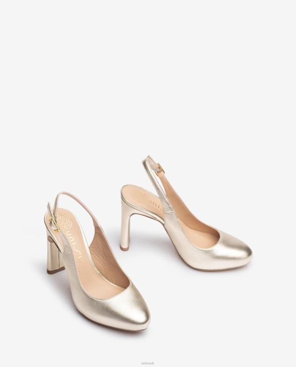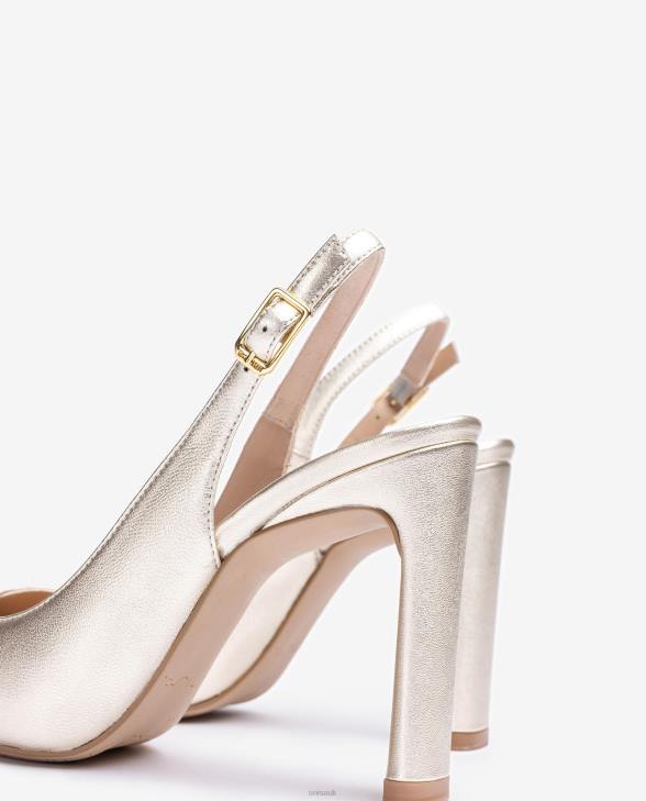 Round toe sling back shoe made in metallic finish leather. 10cm heel covered in suede and a 1.5cm inner platform. Light, flexible, non-slip, rubber sole. An gold ankle strap that can be adjusted using the metal buckle. Your perfect allies for all your events!