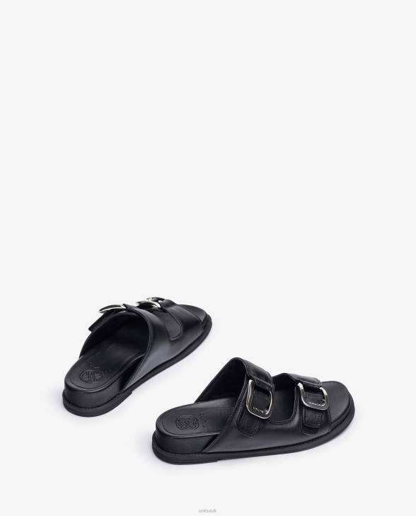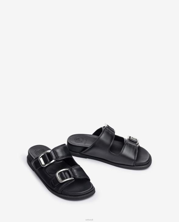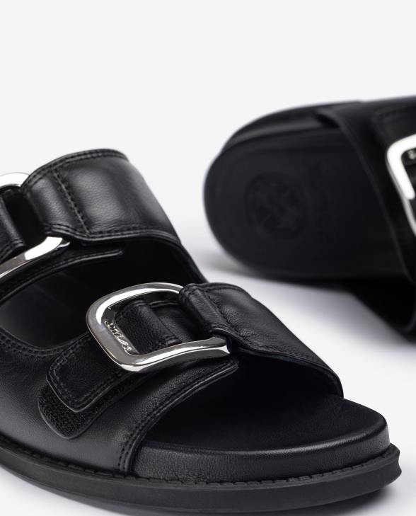 Flat leather sandal with metallic double buckle trim on the vamp. Matching colour midsole and outsole.
