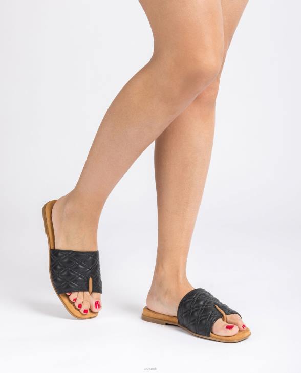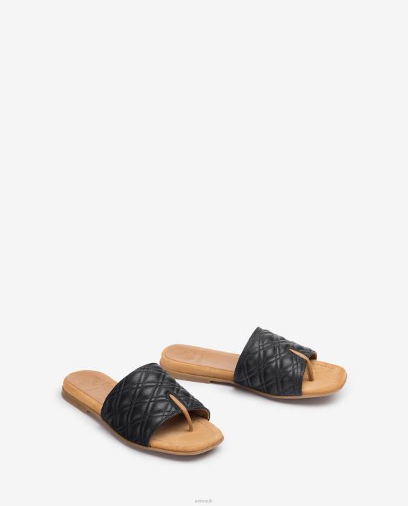 Square toe flat sandal made in leather. Quilted vamp with a geometric design on it and a natural colour leather strap between the toes. Light, flexible, non-slip, rubber sole. Design and comfort provided by Unisa will accompany you in all your steps.