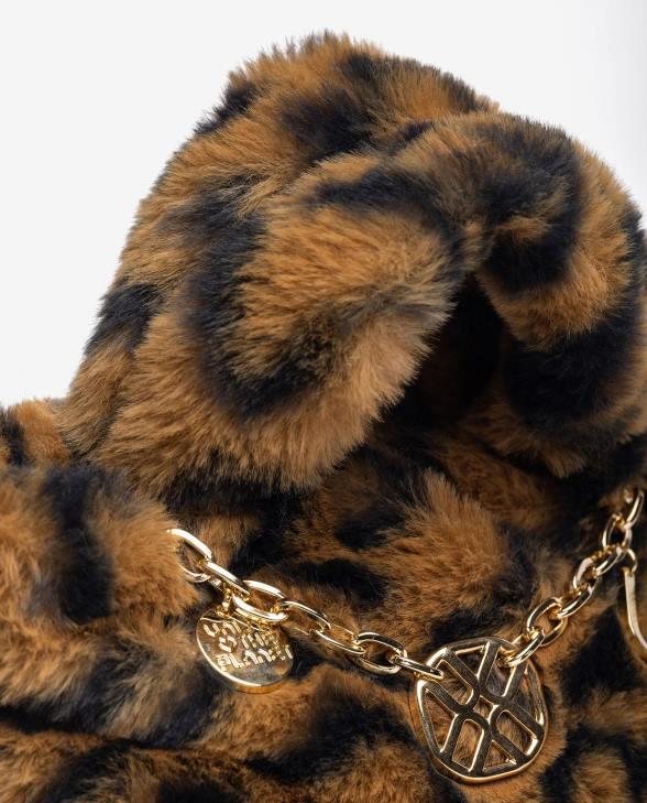Small mini bag made of recycled soft pile fabric. Chain trim and zip fastening. Cross-bag shoulder strap inside. 14cm X 22cm X 9cm