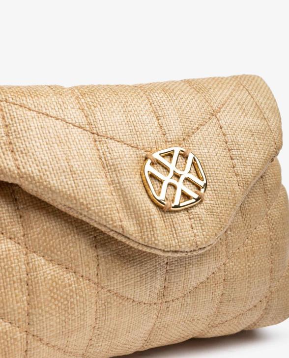 Small handbag made in raffia fabric. A magnetic snap closure on the flap and metallic trim in the centre. Chain strap and a pocket inside. Size: 13cm x 19cm x 6cm