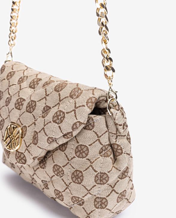 Small handbag made in monogram fabric. A magnetic snap closure on the flap and metallic trim in the centre. Chain strap and a pocket inside. Size: 13cm x 19cm x 6cm