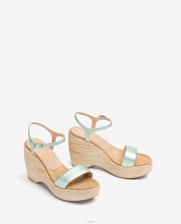 Sandal in various colours of metallic effect leather, a strap on the instep that can be adjusted with the metal buckle. PU wood effect block with an 10cm heel and a 4cm platform. UNISA essence in its pure state.
