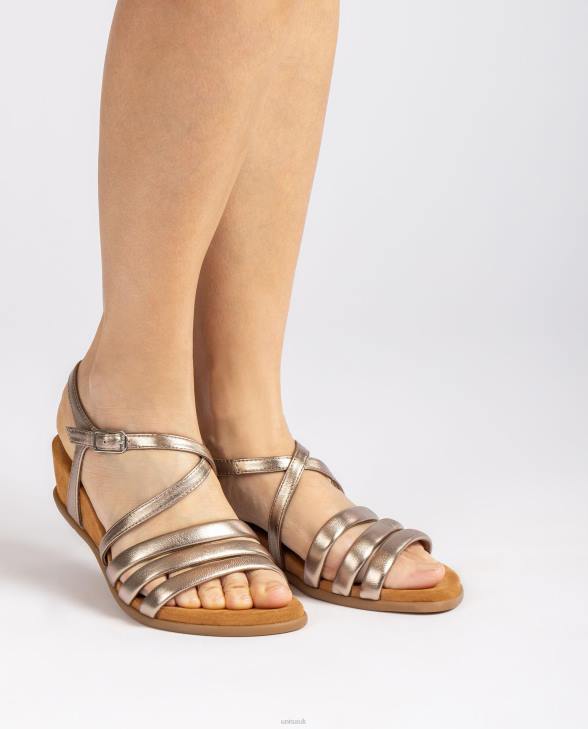 Metallic effect leather sandal with padded straps. 4.5 cm wedge heel and a non-slip, flexible, light rubber sole. Unisa reinvents the sandals for summer 2022.
