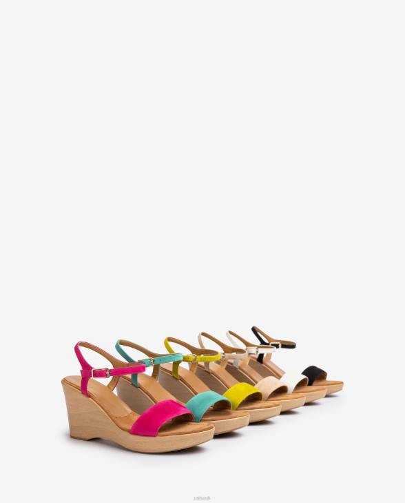 Suede sandal in various colours, a strap on the instep that can be adjusted with the metal buckle. PU wood effect block with an 8.5cm heel and a 2cm platform. UNISA essence in its pure state.