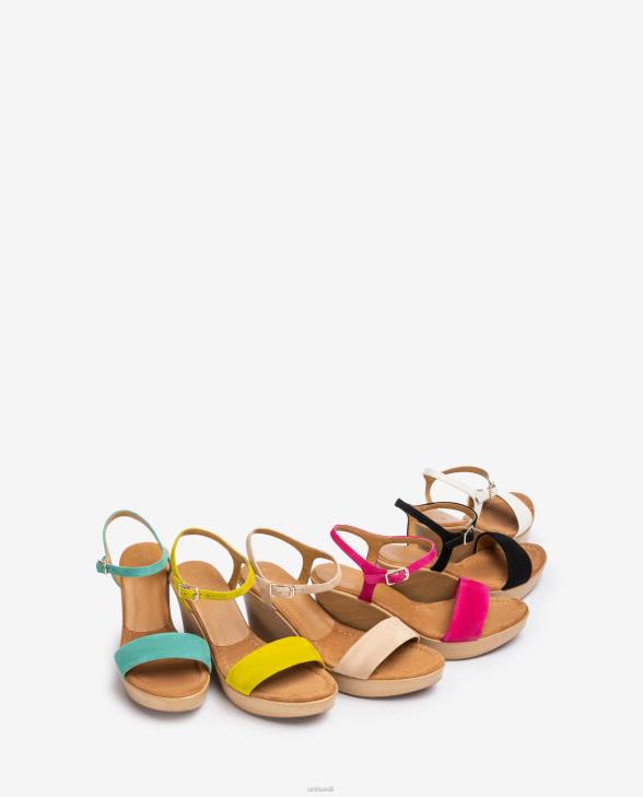 Suede sandal in various colours, a strap on the instep that can be adjusted with the metal buckle. PU wood effect block with an 8.5cm heel and a 2cm platform. UNISA essence in its pure state.